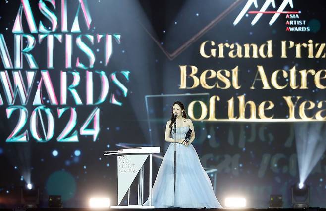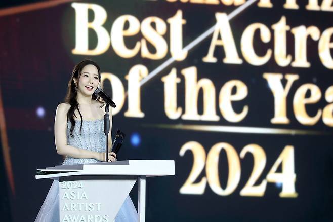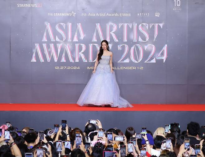 박민영은 태국 방콕에서 열린 'Asia Artist Awards'에 참석해 반짝이는 아이스블루 튜브탑 드레스로 우아한 패션을 선보이며 시선을 사로잡았습니다.