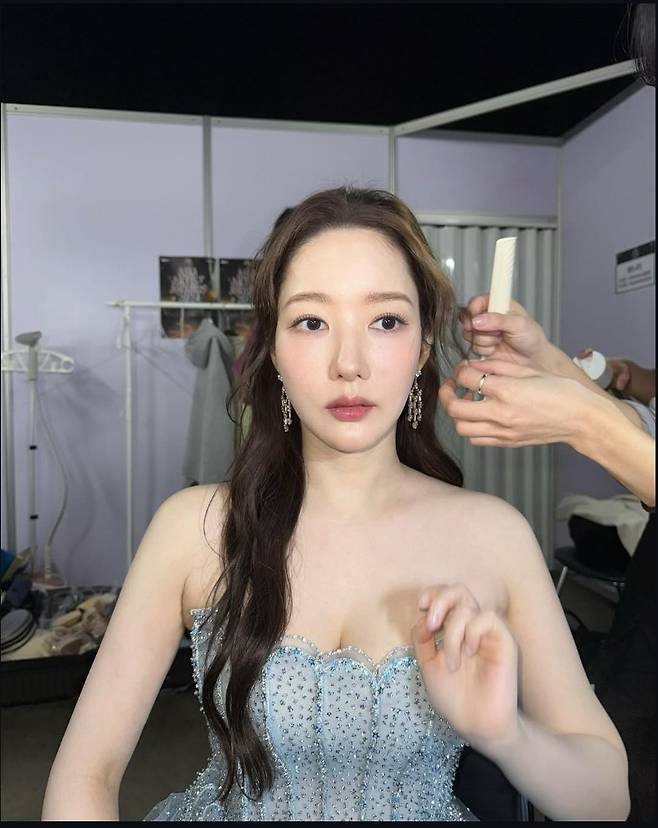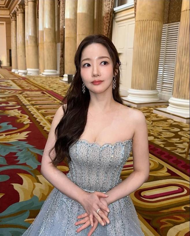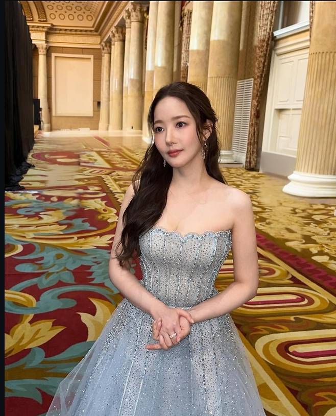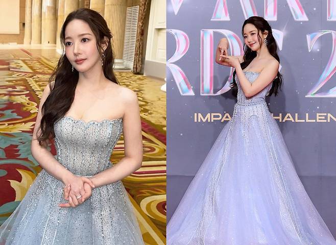 박민영은 아이스블루 컬러의 반짝이는 튜브탑 드레스를 착용해 화사하고 우아한 비주얼을 자랑했습니다.