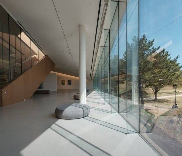 미술관 1층 카페와 2층 전시 공간에서는 창문 틀이 없는 유리창을 통해 푸른 능이 마치 파노라마 회화처럼 펼쳐지는 장관을 감상할 수 있습니다.