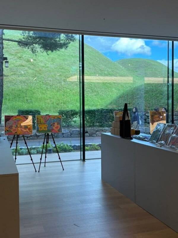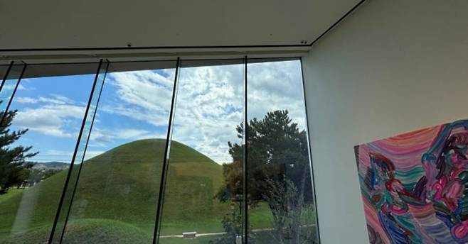 오아르 미술관의 가장 특별한 매력은 건물 정면의 거대한 통창을 통해 신라 고분군을 바라볼 수 있다는 점이에요.