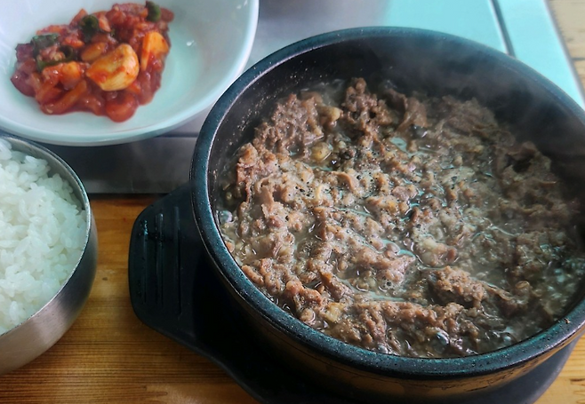 뚝배기에서 보글보글 끓는 불고기에 국물과 밥, 기본찬까지 구성도 알차서 가성비 점심 메뉴로 인기 폭발입니다.