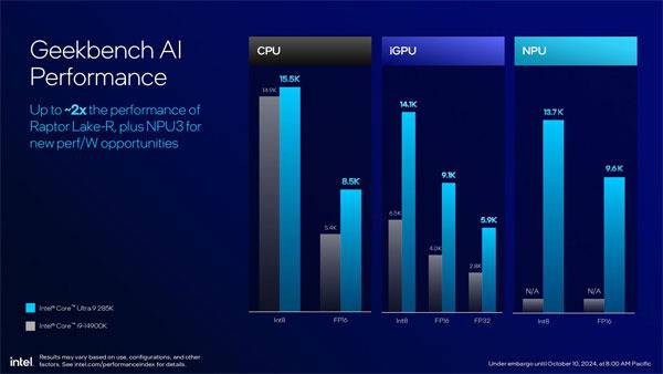 코어 울트라 9 285K는 긱벤치 AI 기준 14세대 코어 CPU 대비 최대 두 배 성능 개선, 경쟁 모델인 라이젠 9 9950X 대비 최대 50% 빠른 성능을 발휘한다. 인텔 발표에 따르면 전반적으로 멀티 스레드 전세대 대베 15%, 라이젠 9 9950X 대비 13% 개선되었다.