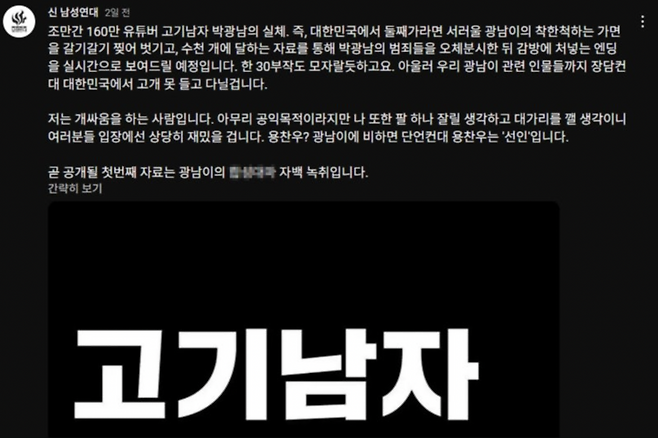 폭로전의 발단은 신남성연대 대표 배인규가 자신의 유튜브 채널을 통해 고기남자의 실명을 ‘박광남’이라고 주장하며 얼굴 사진과 함께 공개한 것에서 시작되었습니다. 배 대표는 "그를 감옥으로 보내는 과정을 실시간으로 방송하겠다"며 고기남자의 과거 행적을 폭로하겠다고 선언했습니다.