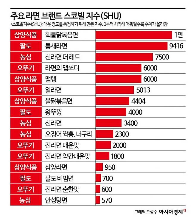 스코빌지수 6000은 신라면(3400SHU), 불닭볶음면(4404SHU)은 물론 오뚜기 제품 중 가장 매웠던 열라면(5013SHU)을 뛰어넘는 수치다. 오뚜기는 '맵쏘디'라는 제품명처럼 단순한 자극을 넘어 매운맛을 하나의 이야기로 풀어내려는 브랜드 전략을 담았다는 설명이다.