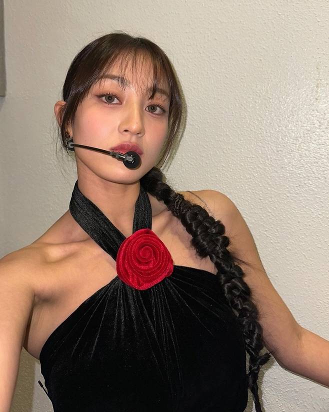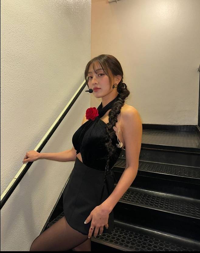 지효는 검은색 홀터넥 벨벳 크롭톱과 미니스커트가 결합된 미니 원피스를 착용한 모습을 선보여 고혹적이고 우아한 매력을 뽐냈습니다.