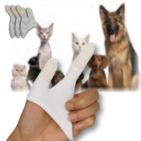 장갑처럼 끼고 사용할 수 있는 강아지 손가락 칫솔이에요. 엄지, 검지에 끼워서 사용합니다. 면 재질로 부드러워 강아지 이빨과 잇몸을 자극 없이 닦아줄 수 있어요. 장갑 형태로 손에서 쉽게 빠지지 않아 더 편하게 사용할 수 있답니다.