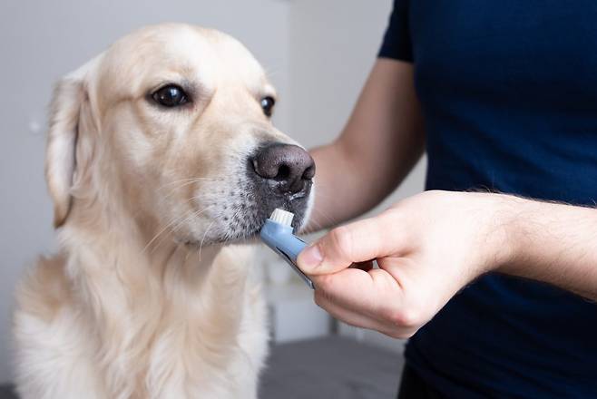 처음부터 칫솔을 사용해 양치질을 하려고 한다면, 강아지가 거부할 가능성이 매우 높아요. 처음에는 손가락으로 입 주변부터 시작해 잇몸, 이빨을 만지는 훈련을 하는 게 좋습니다. 이때, 면 소재의 손가락 칫솔이나 구강 티슈를 활용하는 것도 좋아요.