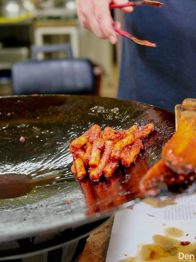 통인시장의 ‘원조할머니 떡볶이집’은 1956년부터 3대째 기름 떡볶이를 판매하고 있는 곳이다. 서울미래유산으로 지정된 맛집이기도 하다. 기름 떡볶이는 고춧가루로 양념한 떡을 기름에 바싹 볶아낸 요리인데, 고춧가루가 타지 않도록 볶아내면서 바삭하게 고루 익히는 것이 포인트다. 고춧가루가 잔뜩 올라가 있어 다소 위협적인 비주얼이지만, 매운 맛보다는 기름과 고춧가루의 고소한 맛이 강하다. 평소 매운 음식을 잘 먹지 못해도 충분히 시도해 볼 수 있다.