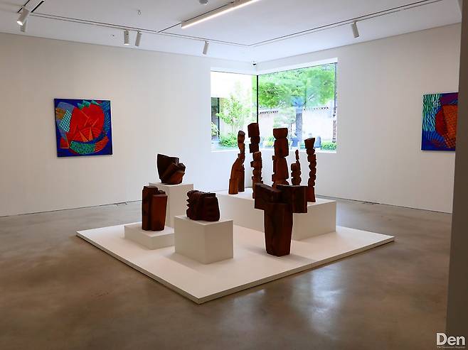 이 날은 아르헨티나에서 작품 활동을 하다 한국으로 거점을 옮긴 1세대 여성 조각가 김윤신 작가의 개인전을 개최하고 있었다. 둘을 합해도 하나가 되고 둘을 나눠도 하나가 된다는 의미의 ‘합이합일 분이분일(合二合一 分二 分一)’ 연작과 회화 작업 일부가 소개됐다. 장승과 숲길에 있는 작은 돌탑들을 연상시키는 조각 작품, 원색을 사용한 강렬한 회화를 통해 염원의 정서와 강인한 생명력을 느낄 수 있었다. 전시관에서 배부하고 있는 안내문에 작품과 작가에 대한 설명이 자세히 적혀 있어 감상에 큰 도움이 됐다. 혼자 여유롭게 시간을 보낼 만한 갤러리를 찾고 있는 이들에게 적합한 공간이다. 5월에는 독일 사진작가 칸디다 회퍼의 신작을 선보일 예정.