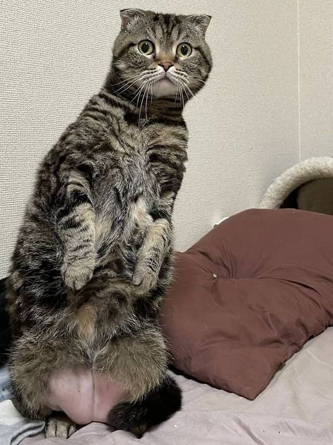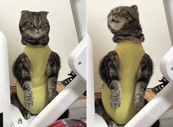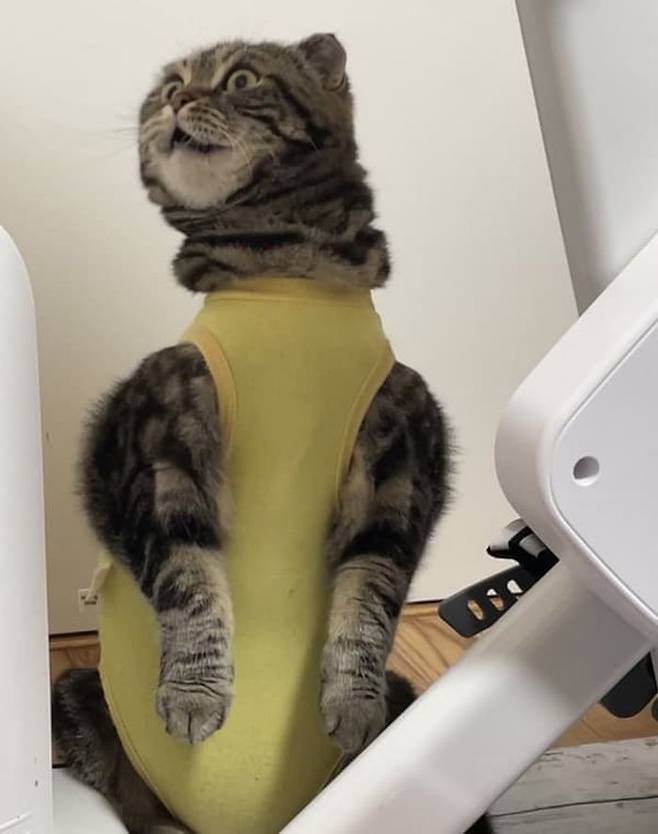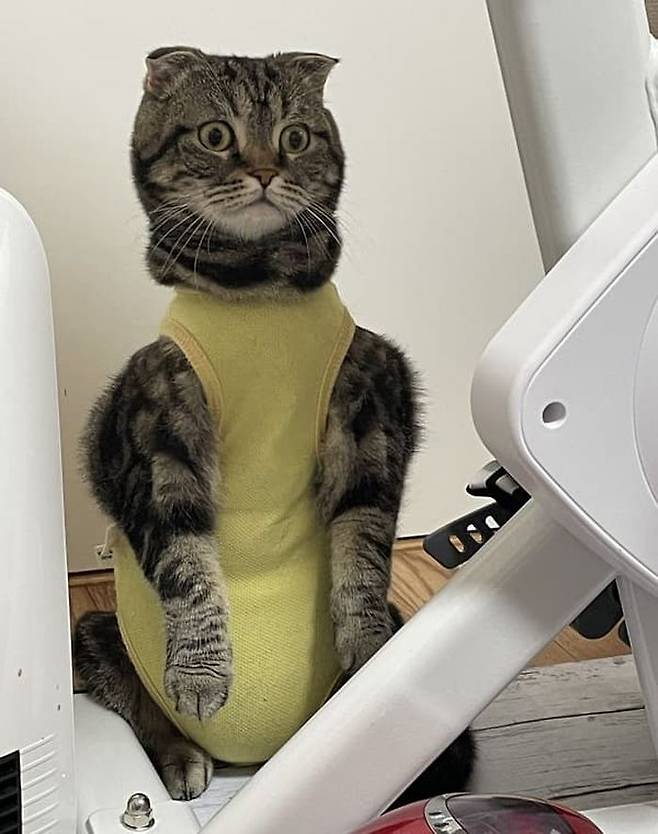상의 부분이 고양이의 몸에 찰싹 붙은 탓에 스코티시폴드 고양이가 엉겁결에 어깨가 딱 벌어져서 넓게 보이는 일이 벌어지게 됩니다.