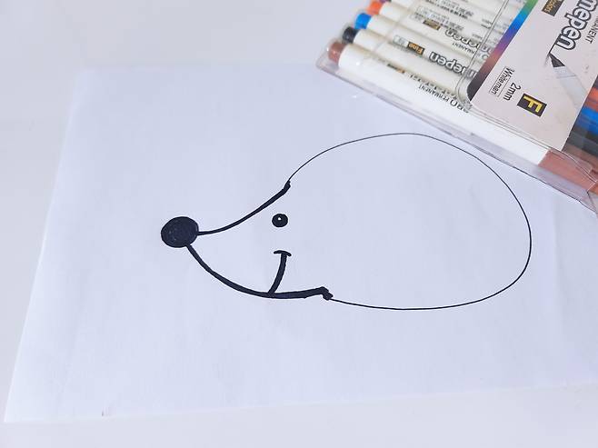 먼저 종이 위에 고슴도치를 그려주세요. 얼굴 부분만 나올거라 얼굴쪽만 신경써서 그려주시면 된답니다. 몸통은 가려지는 부분이라 대충 그렸는데 색종이보다 사이즈가 커서 나중에 잘라냈어요.