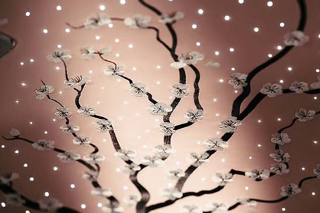 무엇보다 놀라운 점은 조명 처리다. 일반적인 별빛 패턴 대신, 광섬유 조명을 활용해 벚꽃 자수의 음영과 입체감을 살렸다. 조명 하나하나가 수작업으로 배치돼 마치 꽃잎이 바람에 흩날리는 듯한 효과를 만든다. 실내 천장을 보는 것만으로도 진정한 하나미(花見)의 정취를 느낄 수 있다.