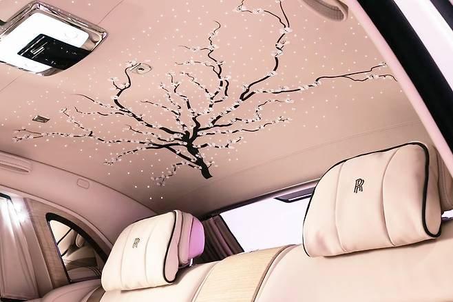 이 차량의 가장 큰 하이라이트는 바로 스티치로 구현된 벚꽃이다. 기존 롤스로이스에 들어가던 ‘스타라이트 헤드라이너’ 대신, 25만 개 이상의 자수로 표현된 벚꽃 가지가 천장 전체를 수놓고 있다. 마치 벚꽃 나무 아래에서 하늘을 올려다보는 듯한 착각을 불러일으킨다.