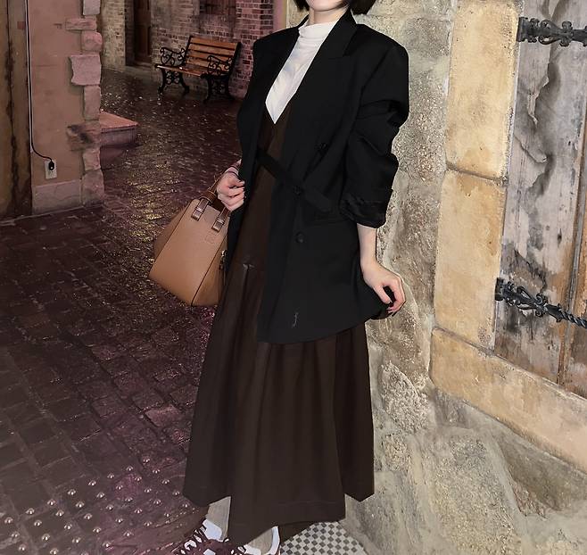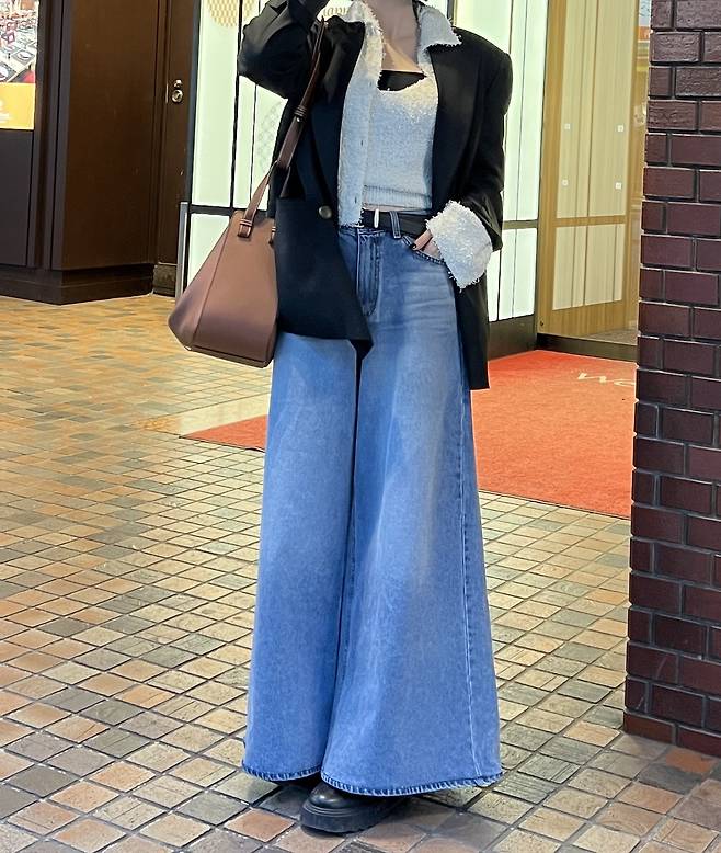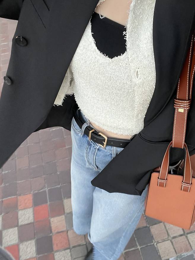 저는 약간 앞쪽 사선 포인트가 들어가있는 자켓과 함께 입었는데