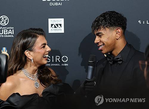 epa11795129 FC Barcelona's Lamine Yamal is interviewed upon his arrival for the Globe Soccer Dubai Awards 2024 Ceremony at the Luxury Hotel of Atlantis, The Palm in Dubai, United Arab Emirates, 27 December 2024. EPA/ALI HAIDER