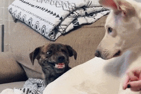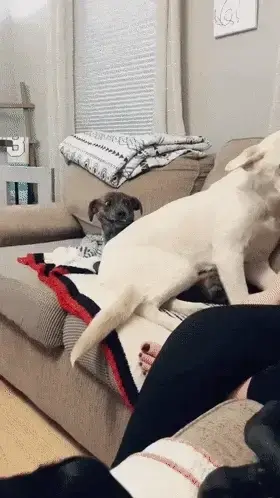 강아지 한 마리가 다른 강아지 위에 엎드려서 주인에게 애교를 부리고 있는데, 아래 깔린 친구는 무척 화가 나 보이는군요. 눌려서 불편한 건지, 아니면 주인에게 애교 부리는 모습을 보고 질투가 난 건지 알 수 없지만, 어쨌든 무척 불쾌해 보입니다!