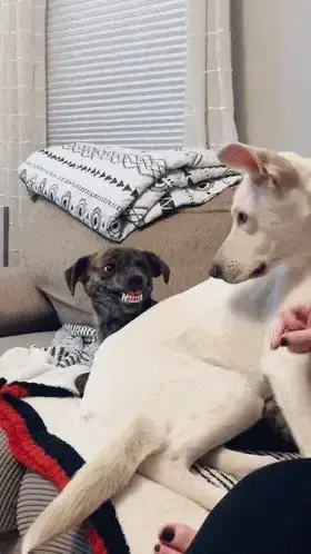 주인의 관심을 독차지하려는 강아지와 그 밑에서 억울함을 느끼는 강아지의 모습, 그리고 짧은 분노까지! 강아지들의 감정 표현이 정말 솔직하고 귀엽네요.