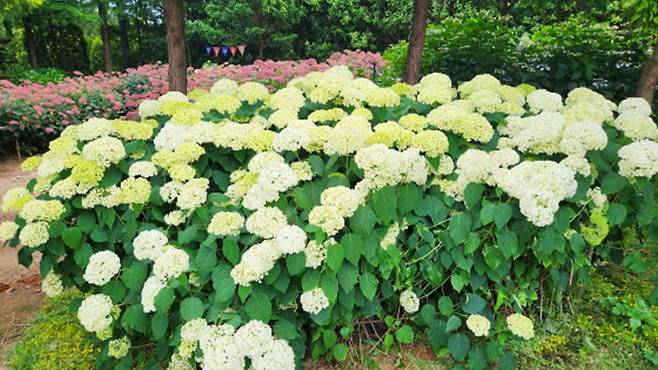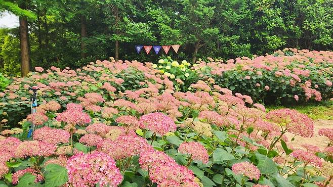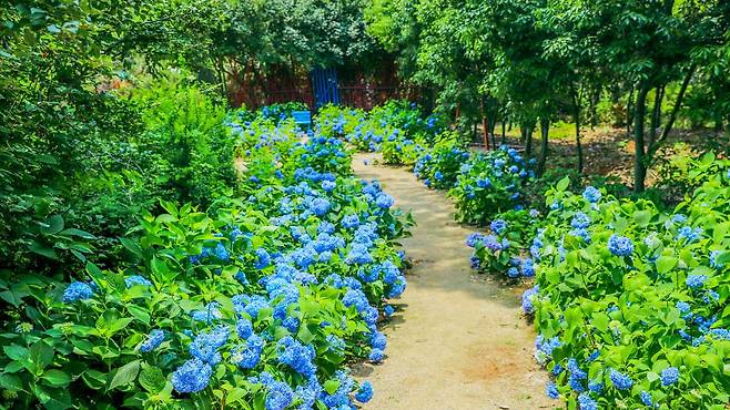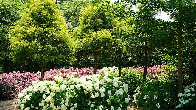 한여름 청산수목원은 마치 수국의 천국에 온 듯하다. 시원한 블루를 시작으로 노란빛, 분홍빛, 라일락 색까지, 수국이 수목원 구석구석을 물들인다.