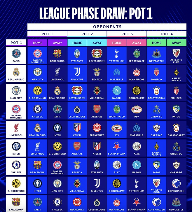 2025~2026시즌 UEFA 챔피언스리그(UCL) 본선 리그 페이즈 대진이 확정되며 팬들의 기대감이 최고조에 달했습니다. 특히 파리 생제르맹(PSG)은 ‘죽음의 일정’에 가까운 조 편성을 받으며 올 시즌 가장 치열한 일정이 될 전망입니다.