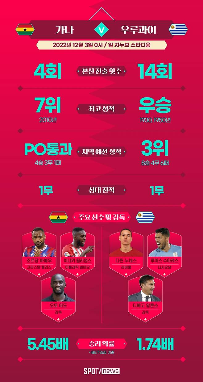 우루과이와 가나는 3일 새벽 12시(한국시간) 카타르 알와크라 알자눕 스타디움에서 2022 FIFA(국제축구연맹) 카타르 월드컵 조별리그 H조 최종전을 치른다.