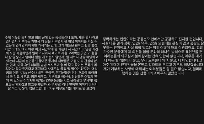뿐만아니라 "힙합 가수인 분들에게 제의 견을 힙합 문화의 하나인 방식으로 표현했을 뿐 여러분들의 의구심과 불쾌감과는 전혀 연관이 없다. 아무튼 내가 너때문에 기분이 이렇고, 우리 오빠한테 왜 저렇고, 네 미안합니다! 아주 위대한 연위인들을 본받고 발라드도 부르고 기부도 해보겠다. 제가 기부하는 사항에 대해서는 여러분들은 알 필요 없다. 알리려 행하는 것은 선행이라고 배우지 않았다"며 비꼬기도 했다.