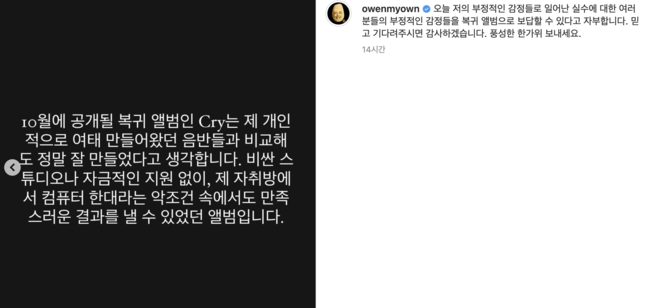 오왼은 "오늘 저의 부정적인 감정들로 일어난 실수에 대한 여러분들의 부정적인 감정들을 복귀 앨범으로 보답할 수 있다고 자부합니다. 믿고 기다려주시면 감사하겠습니다"라고 말했다. 과연 보답의 대상은 누구일까. 적어도 이미 돌아서있는 등에 쐐기까지 박힌 대중들은 아닌듯 하다.