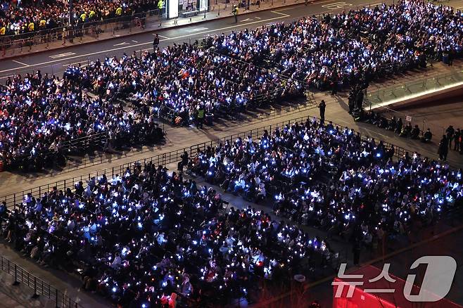 (서울=뉴스1) 사진공동취재단 = 아미(BTS 팬덤)와 시민들이 21일 서울 광화문광장 일대에서 방탄소년단(BTS) 컴백 기념 공연인 'BTS 컴백 라이브: 아리랑' 공연을 관람하고 있다. 2026.3.21/뉴스1