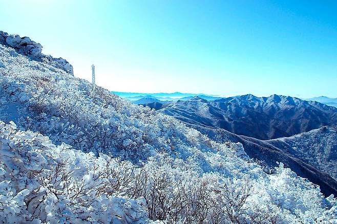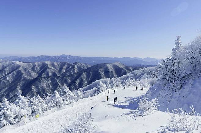 무주 덕유산은 겨울이면 하얀 눈꽃으로 뒤덮인 아름다운 설경을 자랑합니다.