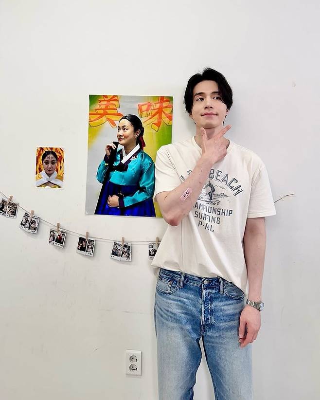또한 손목에 착용한 메탈 시계는 티셔츠와 데님의 캐주얼함을 방해하지 않으면서도 은근한 포인트 역할을 했다. 브이 포즈를 취한 장난기 가득한 표정까지 더해져, 이동욱 특유의 밝고 친근한 매력이 룩 전반에 자연스럽게 스며들었다.