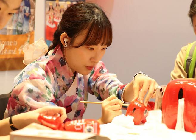 [이데일리 방인권 기자] 22일 서울 강남구 삼성동 코엑스에서 열린 '한일축제한마당 2023 in Seoul'을 찾은 관람객들이 행운을 부르는 붉은 소 아카베코를 만들고 있다.