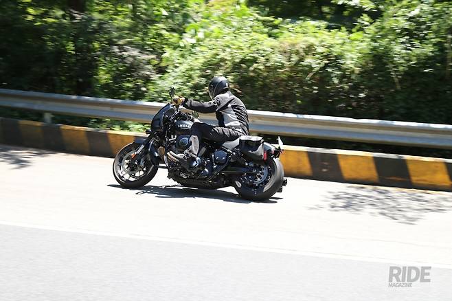 일단 외관부터가 기존 크루저와는 다른 방향성을 지니고 있음을 여실히 보여준다. 전면부의 쿼터 페어링은 크루저 모델에서는 좀처럼 찾기 힘든 파츠인데, 언뜻 클래식 레이스 모터사이클의 전면부를 연상시키는 모양새다. 콤팩트한 사이즈라 방풍 성능에 대한 효과를 기대하긴 힘들겠지만, 스포티함을 보여주는 용도로는 제 역할을 충분히 다하고 있다.