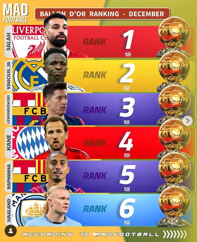 글로벌 매체 '매드풋볼'은 4일(한국시간) 사회관계망서비스(SNS)를 통해 "12월 발롱도르 랭킹"을 발표했다.