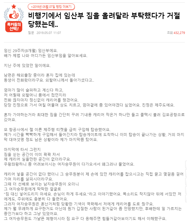 한 온라인 커뮤니티에는 '비행기에서 임산부 짐을 올려달라 부탁했다가 거절당했는데요..'라는 제목의 글이 게재되며 화제가 된바 있습니다. 해당 게시물의 작성자인 A씨는 실제 임신 29주(8개월) 임산부로 제주도행 비행기를 탔다가 겪은 자신의 사연을 공개했습니다.