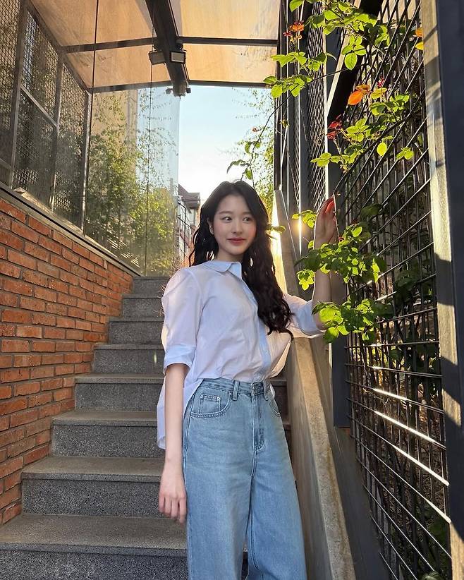팬츠는 허리를 안정적으로 잡아주는 하이웨이스트 디자인으로, 전체적으로 레그 라인을 길고 곧게 연출해주는 역할을 한다. 과하지 않은 워싱이 들어간 연청 데님은 봄빛에 자연스럽게 녹아들며, 상의와의 컬러 밸런스 또한 탁월하다. 계단에 비치는 햇살과 어우러진 데님 특유의 소재감이 더해져 장다아의 내추럴한 매력을 배가시켰다.