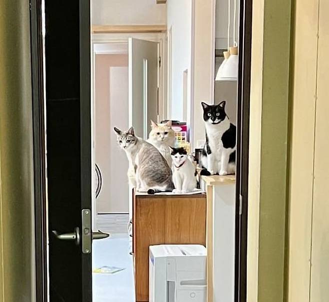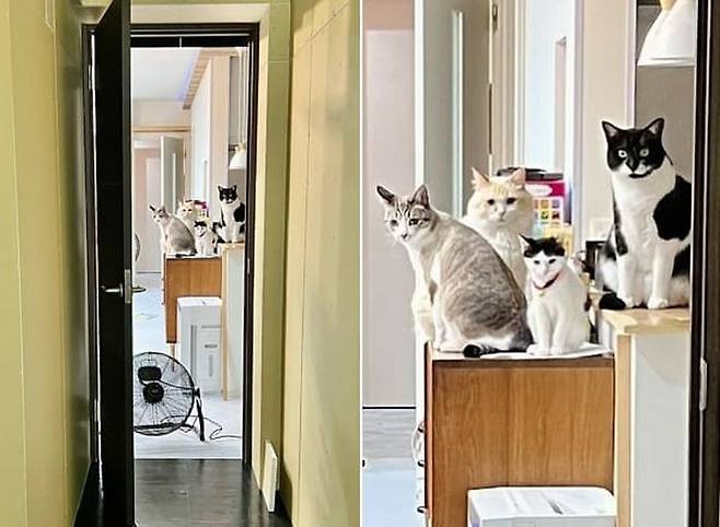 사연은 이렇습니다. 고양이들을 키우는 집사는 SNS를 통해 아이방 앞 거실에 있는 단상에 올라가서는 아이방을 뚫어져라 빤히 바라보는 고양이들 사진을 공개했죠.