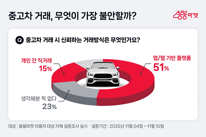 내 차 직거래 앱 붕붕마켓(대표 유효선)이 앱 이용자 대상 중고차 인식조사 결과 중고차 거래 방식 중 앱 웹 기반 플랫폼(51%)을 가장 신뢰하는 것으로 나타났다고 27일 밝혔다.