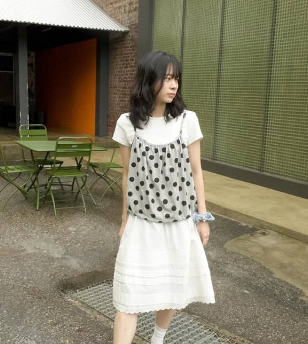 큰 도트 패턴의 나시가 가장 먼저 눈에 띄어요. 러블리 필수템.
