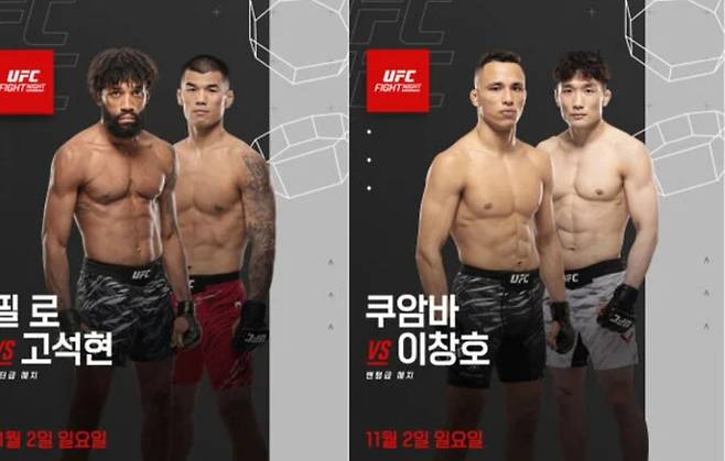 11월 2일 미국 라스베이거스에서 열리는 UFC 파이트 나이트에선 두 명의 파이터가 동반 출전한다. 웰터급 고석현은 필 로우와, 밴텀급 이창호는 티모시 쿠암바와 싸운다.