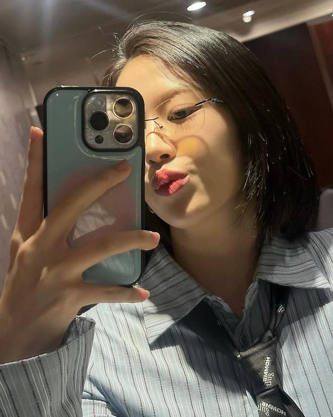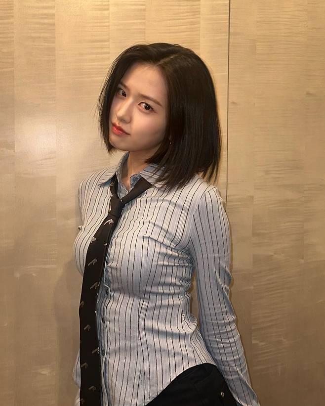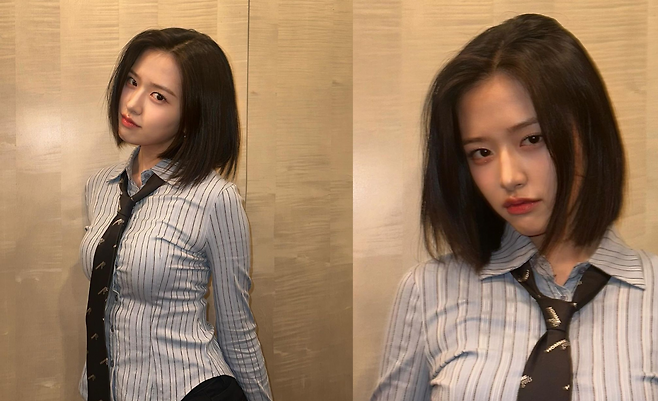 사진 속 안유진은 스트라이프 셔츠와 블랙 타이를 매치하여 글래머스한 몸매를 자랑했다.