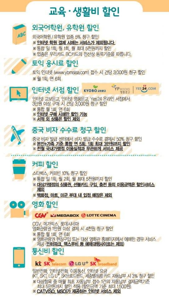 - 가족카드의 부가서비스 전월이용금액, 월별 할인횟수 및 할인한도는 본인카드와 별도로 적용됩니다.