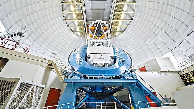 그런데 암흑 에너지가 상수가 아니라 ‘변수(變數)’라는 관측 결과가 나온 것이다. 암흑 에너지의 정체를 밝히기 위한 ‘암흑 에너지 분광 장비(DESI)’ 국제 공동 연구진은 약 1500만개의 은하와 퀘이사(거대 발광체)를 관측한 3년간의 데이터를 분석해 암흑 에너지의 밀도가 지난 45억년간 약 10% 낮아졌다고 미국물리학회를 통해 밝혔다. DESI는 미국 애리조나 키트피크 천문대에 설치된 망원경이다. 5000개의 작은 광섬유 로봇으로 구성된 분광기가 장착돼 5000개의 천체에서 동시에 빛을 포착할 수 있다. DESI 프로젝트에는 한국천문연구원을 포함한 11국 70개 기관의 연구자 약 900명이 참여하고 있다.