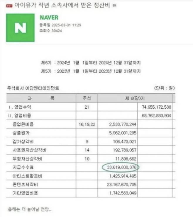 아이유가 소속된 이담 엔터테인먼트의 정보 공개 청구를 통해 2024년 정산금이 밝혀졌는데, 무려 330억 원이래! 💰 이담 엔터에는 아이유랑 우즈, 딱 두 명의 아티스트가 있는데, 우즈는 신인이라 수익 비중이 크지 않을 테니, 거의 아이유 혼자 만들어낸 금액이라고 봐도 무방하겠지? 영업 수익이 74억, 영업 비용이 68억인데, 지급 수수료로 336억이 나간 걸 보면, 이게 아이유와 우즈에게 지급된 정산금이라는 거지! 와우… 😮