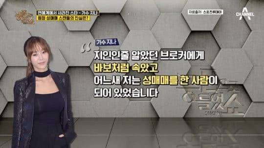 2016년 3월, 몇몇 여성 연예인들이 강대표를 통해 고액의 대가를 받고 해외 원정 성매매를 한 사실이 드러났습니다. 이 사건에서 가장 주목받은 인물 중 하나는 'A씨'로 불리던 가수 지나였습니다.