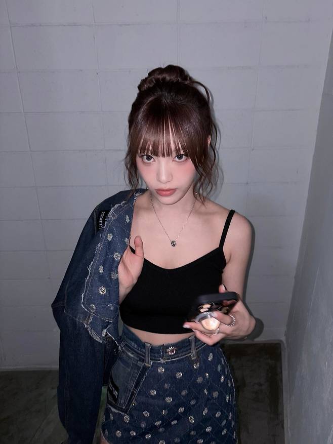 이번 스타일은 블랙 톱과 데님 스커트를 조합한 기본적인 아이템으로 구성되어 있지만, 작은 디테일들이 그녀의 스타일을 특별하게 만들었다. 상의는 심플한 블랙 크롭 탑으로, 날렵한 팔과 각선미를 강조하며, 하의는 화려한 디테일이 돋보이는 데님 스커트로 개성을 더했다. 스커트의 은은한 화려함은 간단한 상의와 완벽하게 조화를 이루며, 여름 시즌에 적합한 시크한 느낌을 선사한다.
