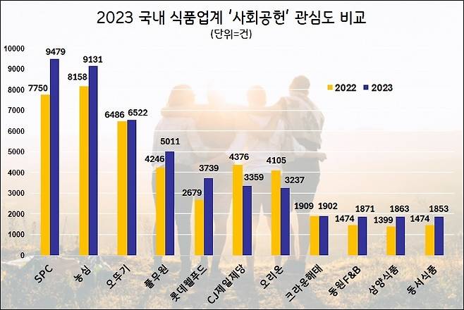 여론조사기관 데이터앤리서치는 주요 12개 채널 23만 개 사이트를 대상으로 2023년 식품기업 11곳의 ‘사회공헌’ 키워드를 통한 관심도를 분석했다.