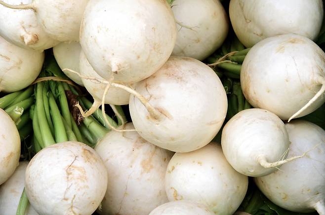 1월 무는 서리를 맞으면서 전분이 당으로 변해 자연 단맛이 최고조에 이르게 됩니다. 국에 무를 넣으면 설탕이 따로 필요가 없고, 생채를 해도 쓴맛이 거의 없어요. 또 무에 들어 있는 디아스타아제는 소화불량, 속 더부룩함을 빠르게 완화시켜 줍니다. 겨울철 고기 섭취가 잦아지는 시기인데 1월 무는 그야말로 소화제 역할을 제대로 합니다.