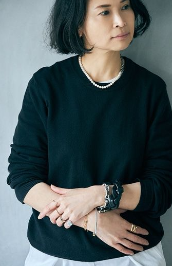 ✔ 클래식한 분위기 : 블랙 티셔츠 + 담수진주 레이어드 목걸이 + 골드 액세서리