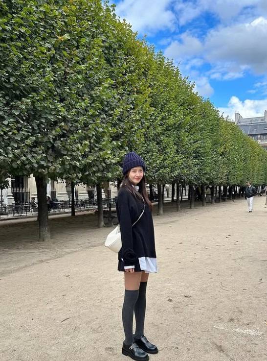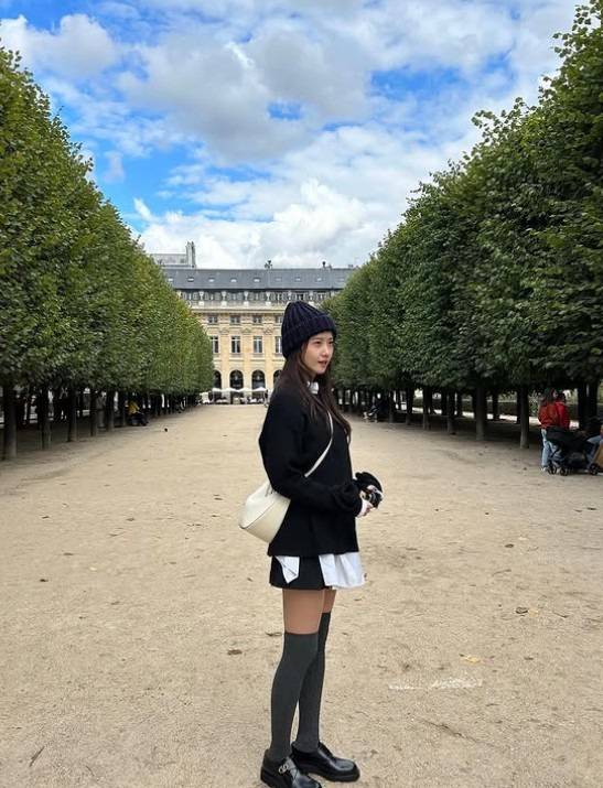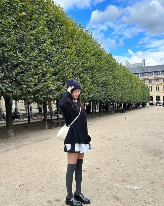 차콜색의 오버니삭스와 검정 로퍼까지 매치해 프레피룩의 감성을 완벽하게 녹여냈어요.