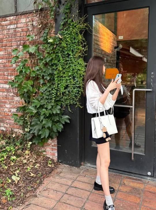 하얀 블라우스와 검정 스커트. 무난한 조합이지만 시스루 재질의 블라우스를 선택해 유니크함을 살렸어요.
