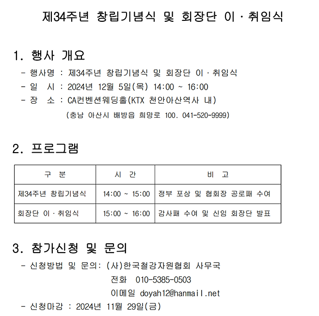 한국철강자원협회는 다음달 5일 오후 2시 KTX 천안아산역사 내 CA웨딩컨벤션에서 '제12대 회장단 이취임식'과 '제34주년 창립기념식'을 개최한다고 밝혔다.